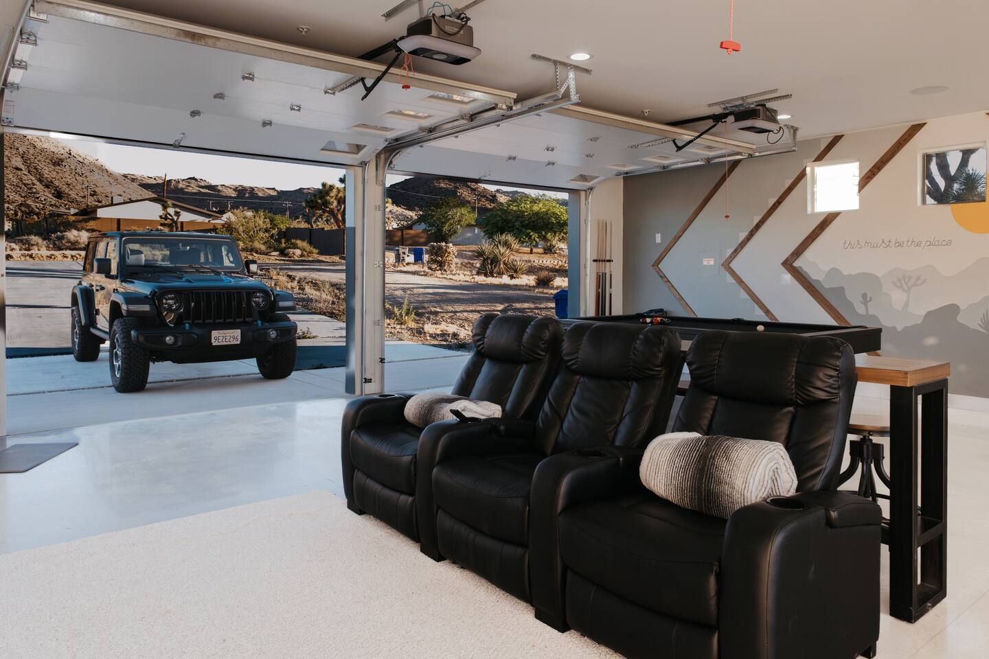 ✨ Game + theater garage (arcade + big-screen movie setup)