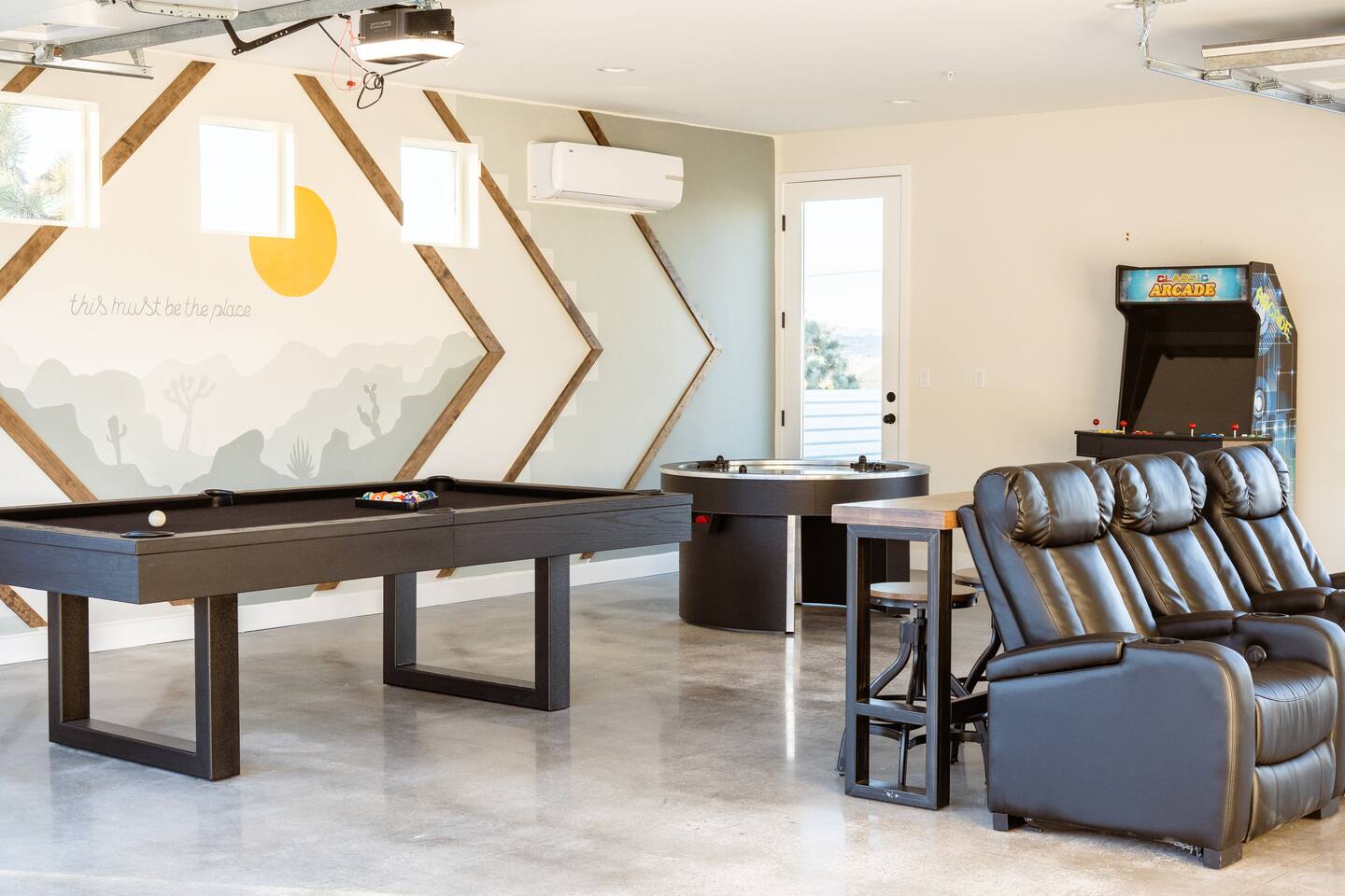 This high-end desert retreat blends wellness with entertainment. A private hot tub, arcade with 3,000+ games, and an 85” theater screen with smart TVs ensure fun at any hour.